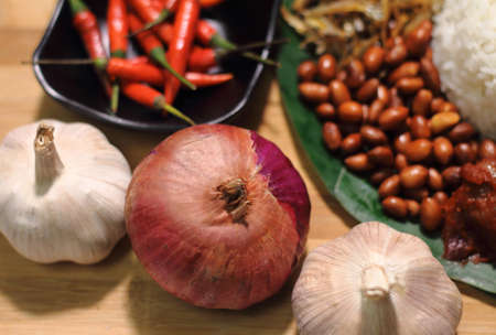Composition of assorted raw food, coconut, onion, ginger, garlic and lemongrass on traditional malay mats