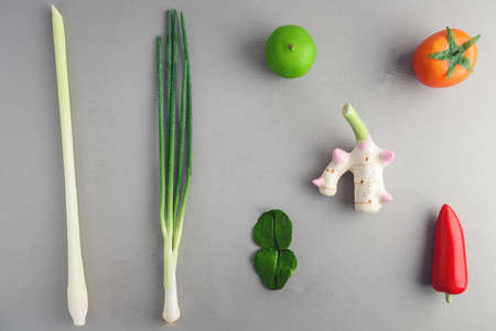 Lime, tomato, galangal, kaffir lime leaves, lemongrass, red chilli prepared to make Tom Yum soup on gray cloth.