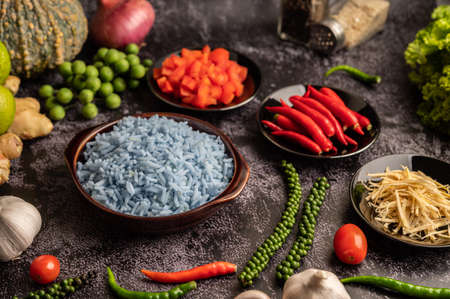 Butterfly Pea flower rice in a brown cup with spices on black cement.