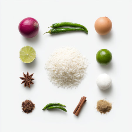 A stylish arrangement of fresh ingredients including rice, spices, and vegetables, showcasing the essence of flavorful cooking on a clean white background.