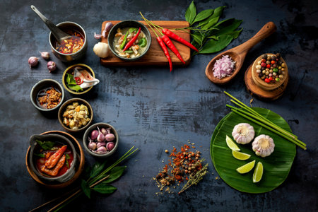 A delightful image of a traditional Thai market stall filled with fresh herbs, spices, and jars of curry paste, capturing the vibrant atmosphere of culinary culture.
