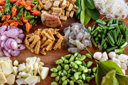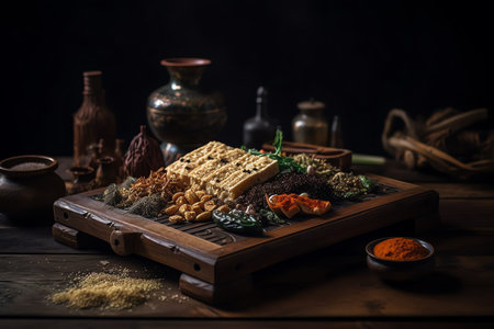 A vibrant arrangement of fresh ingredients for a traditional dish, featuring herbs, spices, vegetables, and eggs on a rustic wooden board. Perfect for culinary photography.
