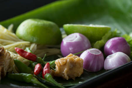 Mix fresh ingredient on banana leaf. (Garlic Shallot, Bergamot leaf, Lemon grass Ginger, Pumpkin)