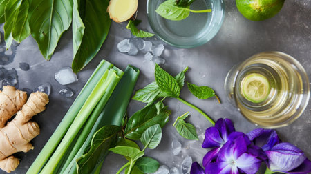 Ingredients for making Thai herbal drinks, including pandan leaves, ginger, and butterfly pea flowers, arranged on a kitchen counter.