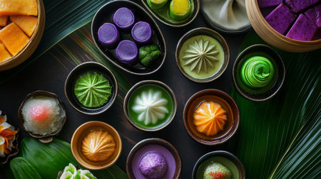A vibrant shot of colorful pandan and taro-flavored desserts, artfully arranged in small bowls, showcasing the unique flavors and aesthetics of Thai sweets.