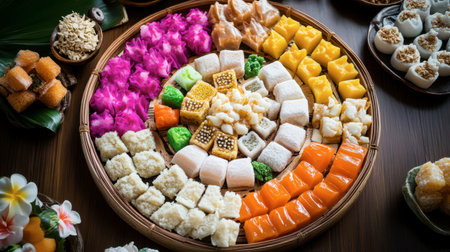 Colorful traditional Asian dessert assortment with nuts and flowers on wooden table, vibrant and inviting presentation