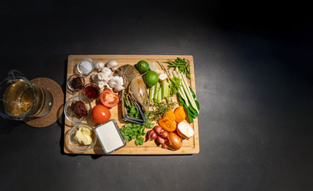 Flatlay Tabletop Ingredients of TomYamKung (Shrimp Spicy Thai Soup) is a prawn, lemon condiment sauces and the others on the kitchen counter.