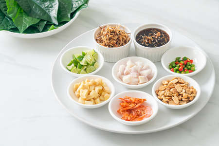 Thai appetizer Miang Kum leaf-wrapped bite-size for eat is a traditional Southeast Asian snack from Thailand