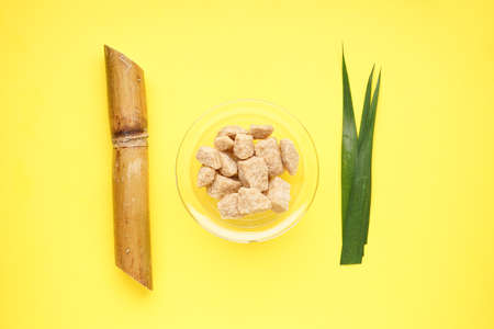 Granulated brown sugar, sugar cane and green leaf on a yellow background. top view.