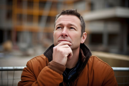 Portrait of pensive man looking away on construction site background.
