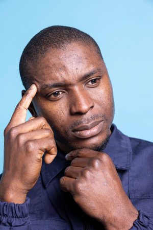 Side View Portrait Of Thoughtful Black Guy On Blue Background