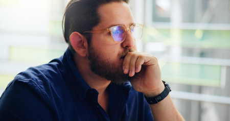 Thinking, insight and business man problem solving, brainstorming and planning in startup. Creative, serious and reflection of idea, vision and solution with content writer for project inspiration