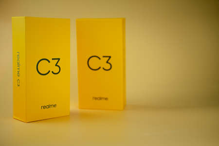 Minsk, Belarus - January 20. 2022: Ozon logo on the screen smartphone closeup, purchased delivered goods in branded boxes on the background
