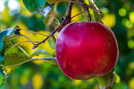 Red ripe apple on branch of tree. Closeup of fresh organic apples with green leaves. Sunny autumn garden in village. Growing seasonal fruits, harvest at farm, agricultural concept