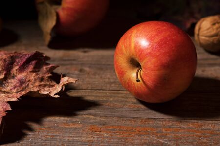 Autumn arrangement - the corner is decorated with a ripe red apple on yellow autumn leaves. Wooden background. Place for text