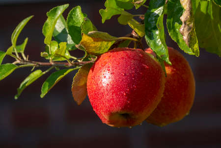 Red apples grow on the branches with leaves in the fresh air