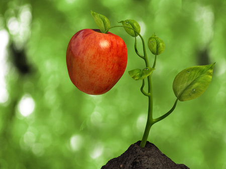 Very high resolution 3D rendering of a small plant an apple.