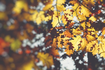Yellow and orange maple leaves on a sunny day in a park with trees