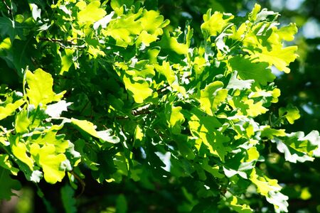 Oak leaves close-up. Tree branches with fresh green leaves. spring background. park or forest.