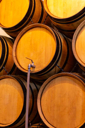 Wine oak barrels in which red wine is aged in the cellar of the winery. The concept of the production of wine