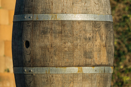 Cork hole in oak barrel with metal rims for aging alcoholic beverages. Winery equipment