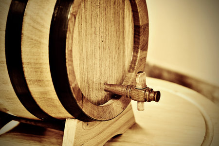 Wooden oak wine barrel. Shallow depth of field.