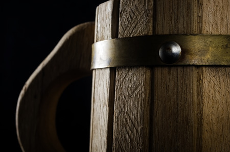 Wooden barrel on dark background, closeup