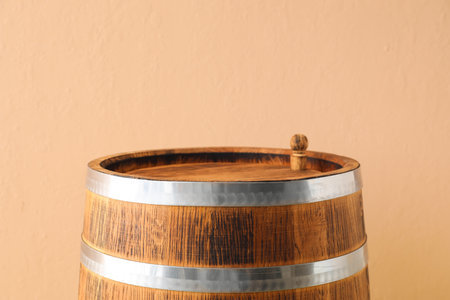 Wooden barrel on beige background, closeup