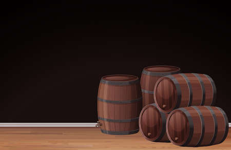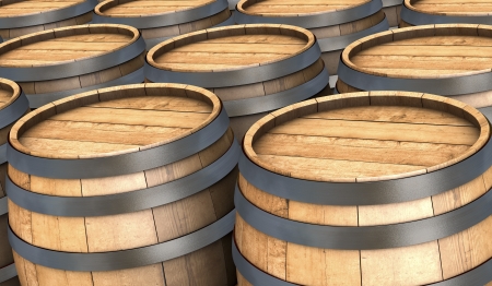 3D rendering of a group of vintage wooden wine and beer barrels standing on a wooden floor.