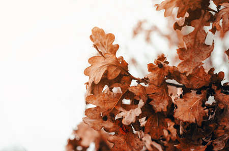 Close up of red or brown oak leaves hanging on branch. Autumnal background.