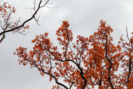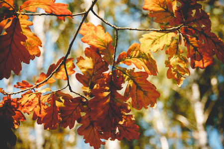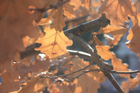 Orange autumn leaves on an oak branch in backlit sunlight vegetative autumn background