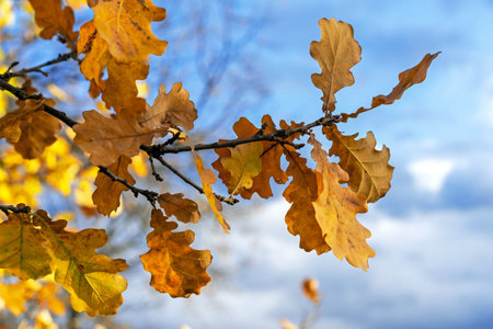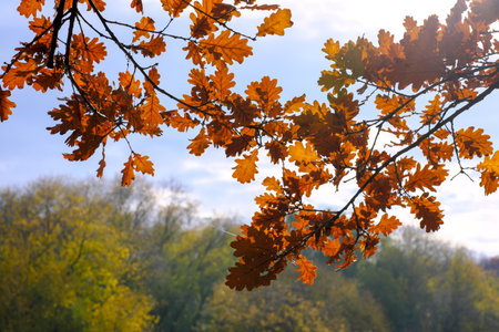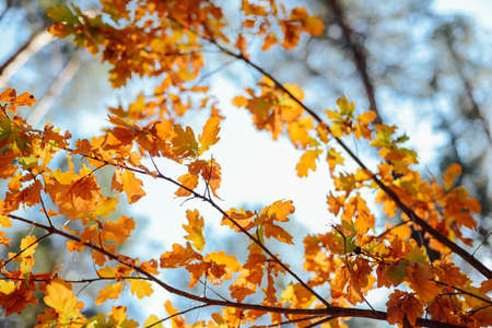 Oak branch with orange and yellow leaves in the forest in autumn. Nature background. Fall season