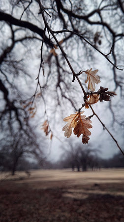 In winter, chilling air envelops, a few lingering leaves tremble, still atmosphere, clean.