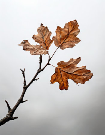 Branch with dry oak leaves against white background. Horizontal image for autumn stories. Japanese style
