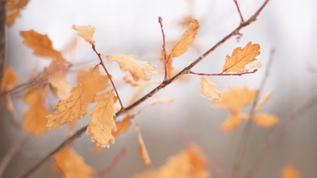 Vibrant orange leaves hang from branches during autumn, creating a stunning display of seasonal colors against a light background. The serene atmosphere captures the essence of fall.