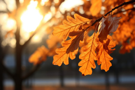 Captivating golden oak tree leaves illuminated by warm sunlight in a picturesque natural setting
