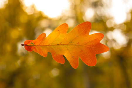 a detailed close up of an orange and yellow oak leaf during the autumn season with a blurred background