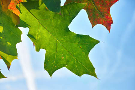 Fall of leaves in autumn, colorful american oak tree leaves close up