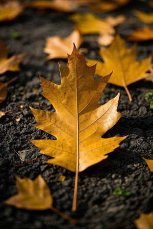 Yellow and orange maple leaves on a sunny day in a park with trees