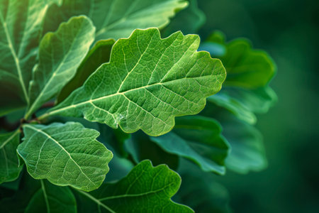 close-up view of beautiful green oak leaf on a tree branch in a forest park in summer outdoors, colorful foliage in the garden with detail, fresh natural leaves on the wind closeup, nature background