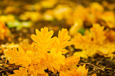 Fallen oak leaves with selective focus. Dry oak leaves on the ground. Autumn forest background. Copy space