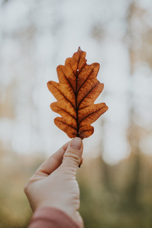 Yellow oak leaf in a woman's hand. Autumn seasonal concept. Fall mood.