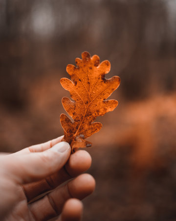 A close-up shot of an adult hand holding dried brown autumn leaf on a blurred brown background