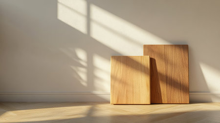 A serene view of two wooden panels illuminated by soft sunlight, casting gentle shadows on the floor, creating a calming and stylish atmosphere.