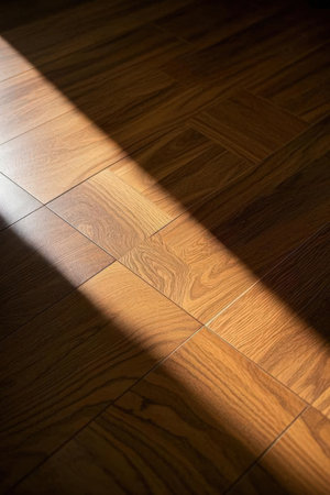 Explore the detailed design of intricate parquet flooring featuring a stunning wood texture illuminated by soft light and shadow effects, creating a warm and inviting ambiance.