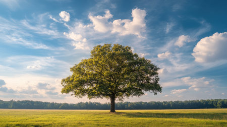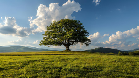 A solitary, ancient oak tree stands proudly on a grassy hillside, overlooking a serene landscape.