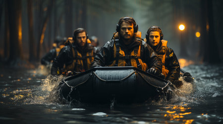 Rescuers search for people trapped in floods using rubber boat. Generative AI