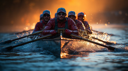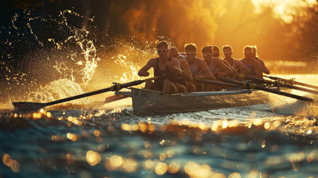 Rowers paddle in perfect unison on golden-lit river, creating dynamic splashes and movement in a cinematic outdoor sports scene.