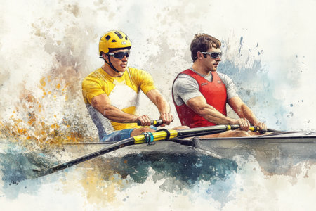 Watercolor-style painting of two men rowing together in a boat race competition, with one wearing a yellow and white shirt and helmet on his head, while the other is dressed in a red vest over a grey T-shirt. The background features water elements and blurred smoke to create an atmosphere for an Olympic racing event. --ar 3:2 --v 6.1 Job ID: 39c69e29-5f0c-419e-b5d3-19d4b0a6c967