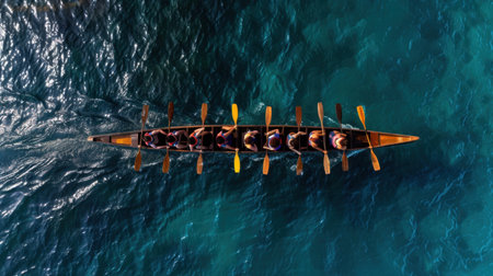 Aerial view of a rowers rowing in the sea, A bird's-eye view of a rowing team in perfect sync, AI Generated